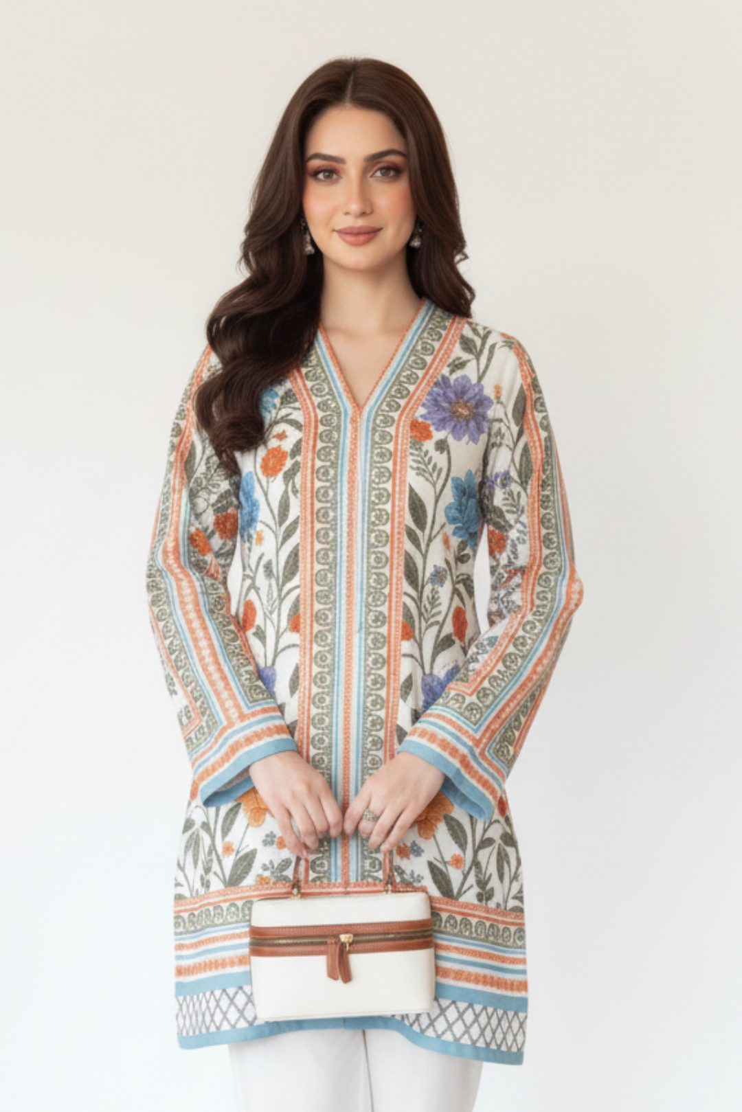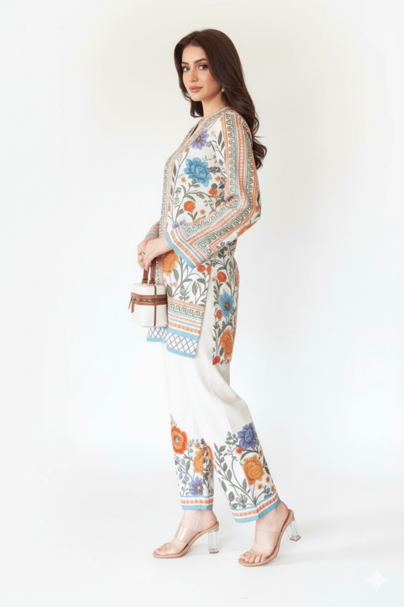 Bright, graceful, and effortlessly chic – Daisy Bow is a statement co-ord set that brings together intricate prints and timeless elegance. Designed with a soft cotton-silk blend, this white and multi-color kurta set is a versatile outfit for both casual outings and semi-formal gatherings.